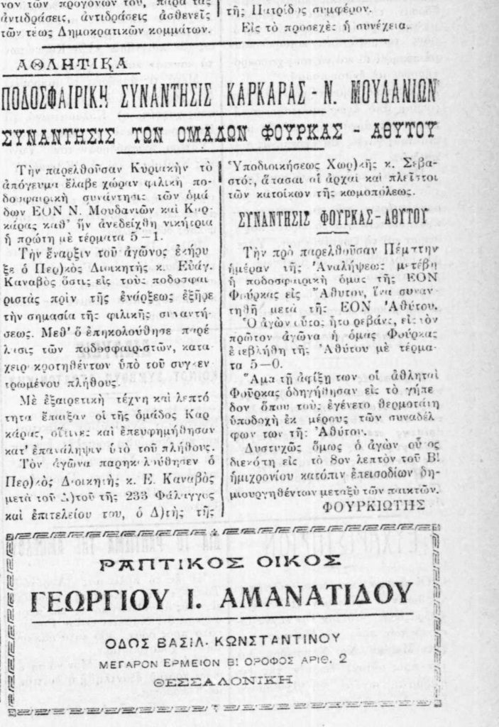 Η πρώτη πηγή αναφέρεται στον γενικό τίτλο της εφημερίδας, ενώ στη δεύτερη εμφανίζεται η αθλητική στήλη όπου καταγράφεται η ήττα της ομάδας της Καρκάρας απέναντι στην ομάδα της ΕΟΝ Νέων Μουδανιών με σκορ 5–1. Ο αγώνας χαρακτηρίζεται από εξαιρετική εμφάνιση, τεχνική και πειθαρχία, με τη συμμετοχή πλήθους κατοίκων που υποστήριξαν θερμά τους παίκτες.